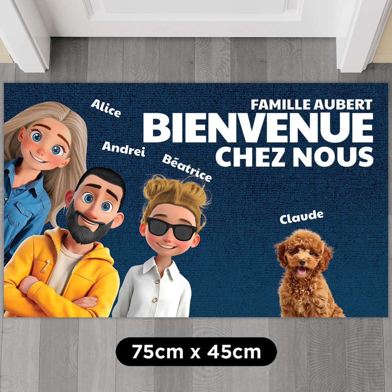 Bienvenue chez vous avec un paillasson familial personnalisé mettant en vedette une illustration de style dessin animé de votre famille, de vos animaux de compagnie et même de votre nom de famille ! Choisissez parmi 3 citations touchantes et plusieurs couleurs de fond pour créer un paillasson aussi unique que votre famille.